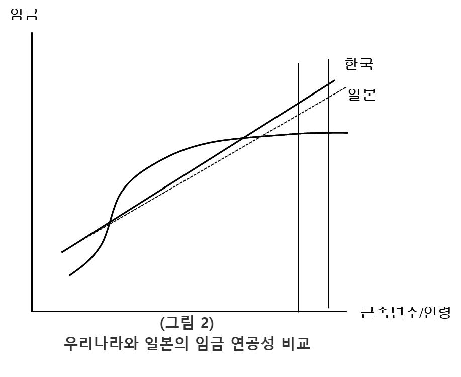 「상생임금위원회」의 자료에 의하면 우리나라에서는 근속이 30년 이상인 근로자가 신입사원보다 2.87배의 임금을 받고 있으며, 이는 일본과 EU의 2.27배, 1.67배에 비해 높은 수치이다. 임금체계 개혁을 주장하는 사람들은 이러한 국제 비교를 근거로 우리나라의 임금 연공성이 지나치게 높다고 주장한다. 하지만 임금 연공성은 다양한 제도적 요인들에 의해 영향을 받기 때문에 다른 나라와 단순히 비교하는 것은 적절치 않다. 이를 이해하기 위해서 아래의 그림을 보자.
