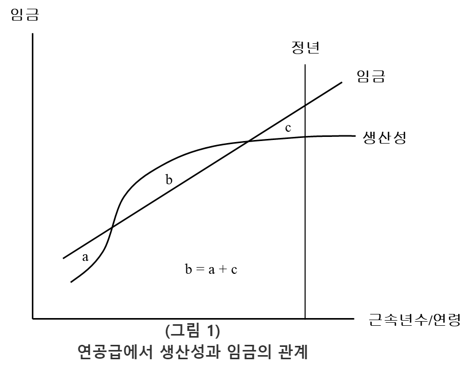 (그림 1)은 연공급에서 생산성과 임금의 관계를 보여주고 있다. 연공급에서 임금은 근속이 증가함에 따라 선형적으로 증가하지만, 생산성은 S자의 학습곡선 형태로 변화한다. 따라서 연공급에서는 각 시점의 생산성과 임금이 일치하지 않는다. 하지만 조직이 필요한 인재를 확보·유지하기 위해서는 생산성과 임금이 균형을 이루어야 하므로, 연공급은 근로자의 총생산성과 총임금이 같아지는 시점(b=a+c)에 근로계약을 해지함(정년)으로써 생산성과 임금의 균형을 유지하게 된다.