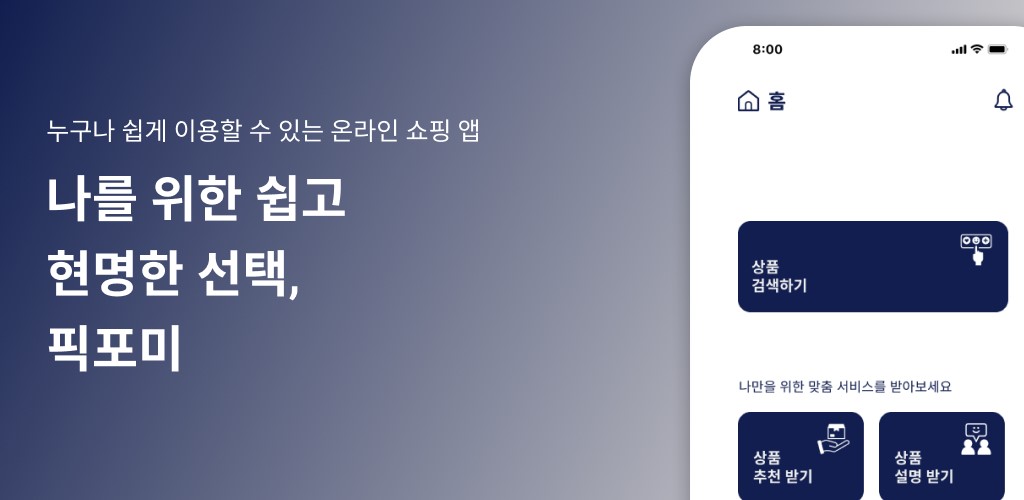 2) 픽포미는 시각장애인들의 온라인 쇼핑을 도와주는 서비스입니다. 제품의 이미지 묘사, 상세 설명, 리뷰 등을 AI를 통해 빠르게 정보를 받을 수 있어요. 픽포미 매니저라는 이름의 서비스를 제공하여 카카오 쇼핑, 11번가, 무신사 등 인기 쇼핑 링크를 픽포미에 붙여 넣기만 하면 상품 검색부터 설명까지 쇼핑의 전 과정을 도와드리고 있습니다. 픽포미는 올해 7월 픽포미3.0 버전을 업데이트하여 출시했으며 고객 만족도와 이용자 수 또한 꾸준히 늘고 있습니다.