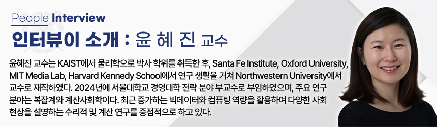 전략은 가장 물리학적으로 접근하는 사회과학이라고 생각해요. 어린 시절부터 과학을 좋아해서 과학고에 진학했고, 특히 물리학에 매료되었는데, 그 이유가 물리학은 수학적 엄밀성을 추구하면서도 현실과 맞지 않으면 수학이론을 과감히 수정한다는 점이 충격적이며 동시에 매력적이기 때문입니다. 이러한 관심은 통계물리학, 그 중에서도 복잡계와 네트워크 과학으로 이어졌습니다. 통계물리학은 공기나 물의 부피, 압력, 흐름과 같은 거시적 현상을 원자나 분자와 같은 미시적 입자들의 동적 상호작용으로 설명하고, 방대한 데이터를 기반으로 이론을 정립합니다. 이런 접근법으로 네트워크의 구조와 복잡한 시스템의 작동 원리를 이해할 수 있었고, 이는 KAIST 물리학과에서 시작해 노스웨스턴 켈로그 경영대학까지의 여정을 연결할 수 있는 연구 철학이 되었습니다.