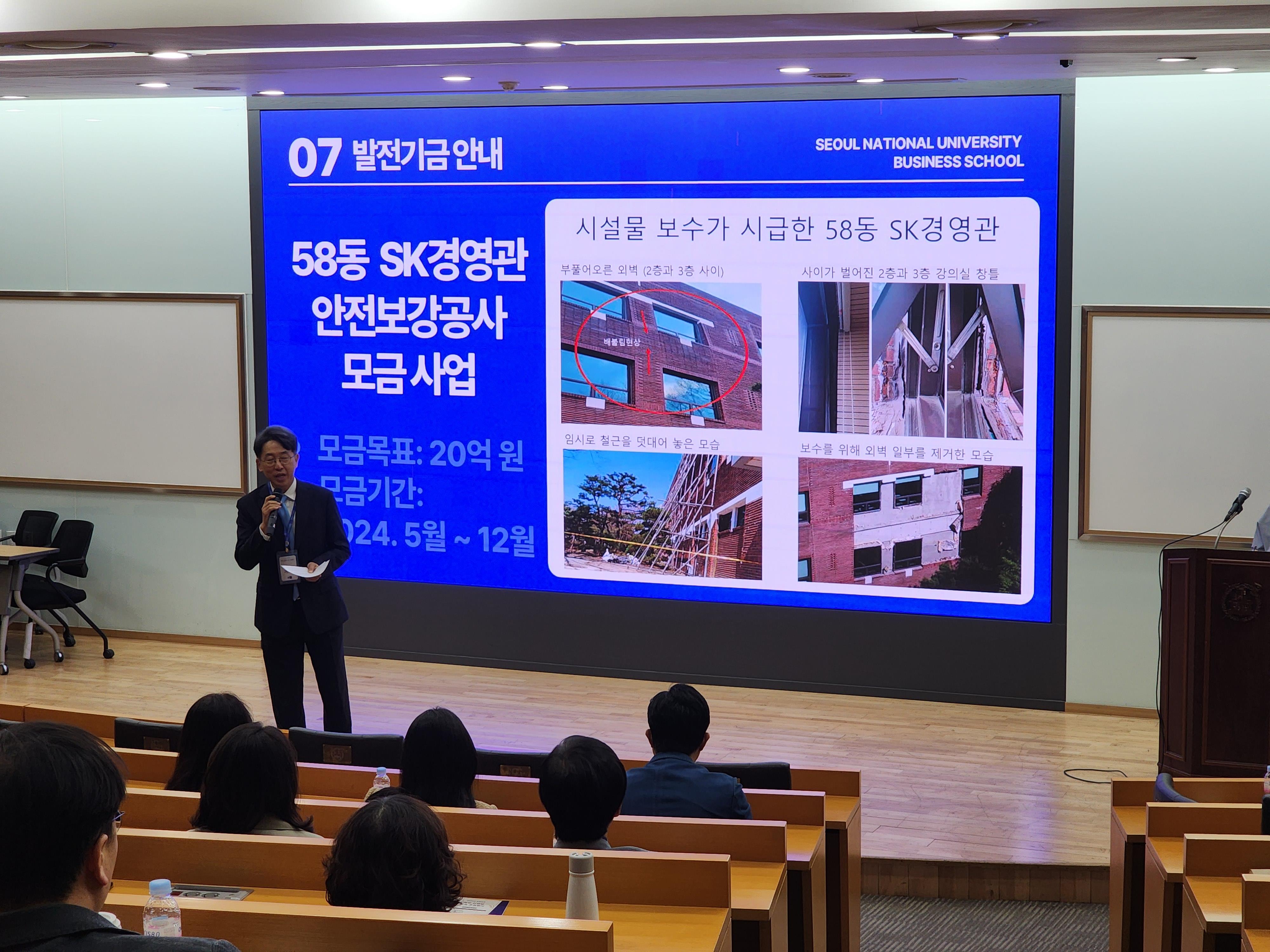 경영대학을 아끼고 사랑하는 가족들의 마음이 하나로 모일 수 있길 바라며, 오전 일정의 마지막 순서로 채준 학장의 ‘58동 SK경영관 안전보강공사 발전기금 모금 사업 안내’가 이어졌다.