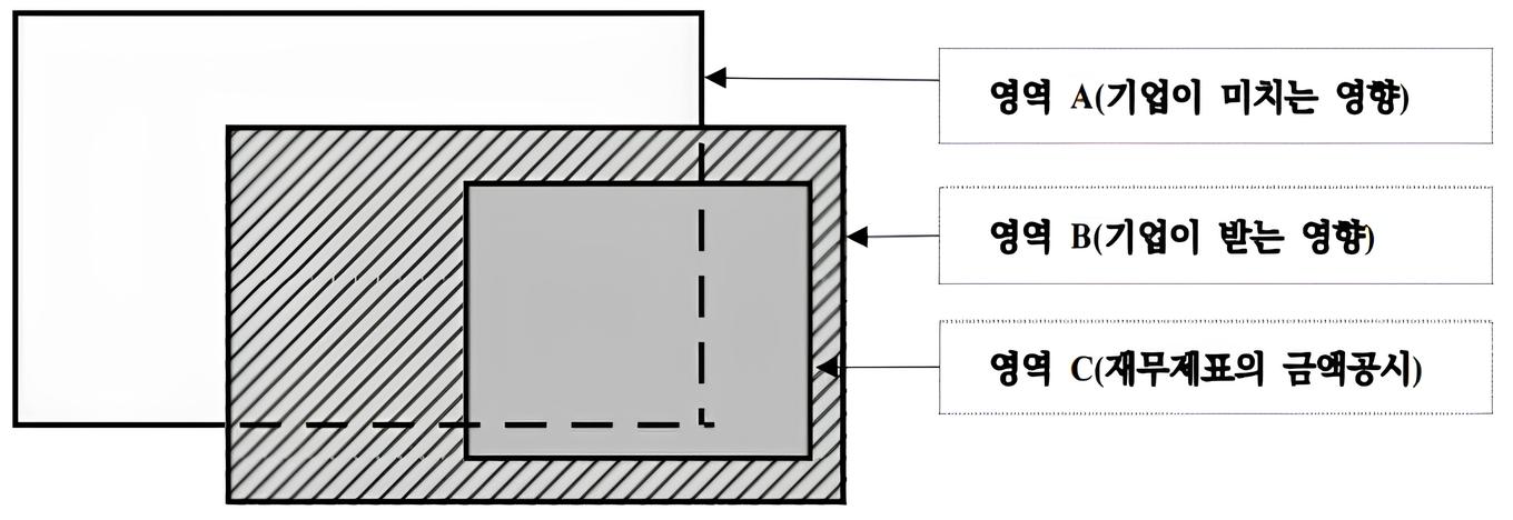 <그림 1>에서 영역 A는 기업이 환경과 사회에 미치는 영향을 나타내며, 기업이 오염물질을 배출하여 환경과 사회에 미치는 부정적 영향을 대표적인 예로 들 수 있다. 영역 B는 기업이 환경과 사회로부터 받는 영향(즉, 기업가치에 미치는 영향)을 나타내며, 기업이 해수면 상승으로 인해 받을 수 있는 직간접적인 피해를 예로 들 수 있다. 영역 C는 재무제표에 반영된 화폐금액으로, 보고일 기준으로 이미 발생한 회계 거래의 영향과 미래 현금흐름 추정치(예: 충당부채)가 포함된 기업가치 정보를 의미한다. 여기서 유의할 점은 영역 B가 개념적으로 영역 A의 부분집합이 아니라는 것이다. 예컨대, 특정 기업이 해수면 상승으로 인해 입을 수 있는 피해(영역 B)는 그 기업이 환경과 사회에 미친 영향(영역 A)으로 인한 결과가 아닐 수 있다.