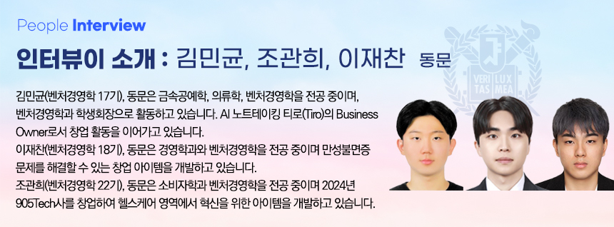 벤처경영기업가센터 이야기에는 벤처경영학 재학생 및 졸업생, 센터 프로그램에 참여한 창업팀들을 인터뷰하고 청년 창업가들의 이야기를 소개하고 있습니다. 관심있는 분은 snustartup@snu.ac.kr로 문의 바랍니다.