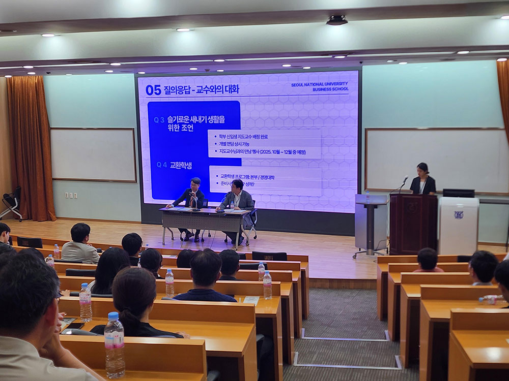 다음으로 학장단 주도로 진행된 ‘교수와의 대화(질의응답)’ 시간과 제39대 경영대학 학생회[새벽]의 ‘서울대 학생들의 캠퍼스 생활’ 소개가 이어졌다. 그동안의 궁금증을 해소하고 경영대 학생의 생활에 대해 낱낱이 살펴보는 시간이 되었다.