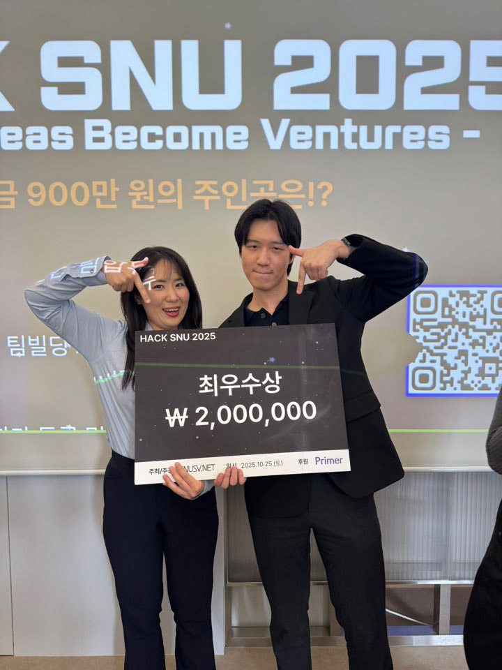 서울대학교 경영전문대학원 MBA 과정의 박은혜(20기), 조영승(20기) 학생과 인공지능대학원 박사과정 김성돈 학생으로 구성된 팀이 ‘HACK SNU 2025 – Where Ideas Become Ventures’에서 최우수상(2등)을 수상했다. 이번 대회는 서울대학교 창업지원단이 주최하고 스타트업 액셀러레이터 Primer가 공동 주관한 서울대 최초의 전 구성원 통합 창업 해커톤으로, 총상금 900만 원 규모로 진행되었다.