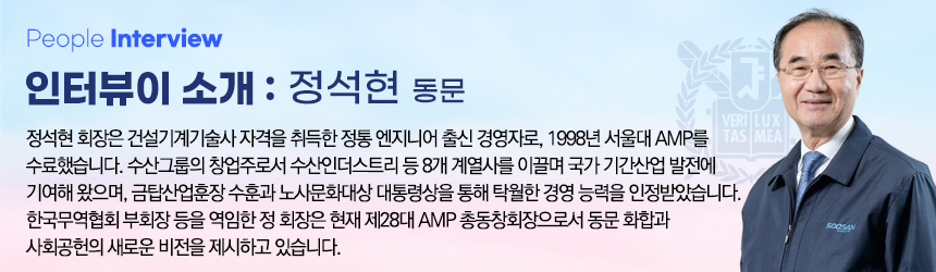 대한민국 최고의 대학인 서울대학교 경영대학 최고경영자과정(AMP) 제28대 총동창회장이라는 중책을 맡게 되어 깊은 감사와 함께 막중한 책임감을 느낍니다. 특히 올해는 AMP 과정에 101기 신입생이 입학하는 뜻깊은 해입니다. 지난 50년 동안 선배님들께서 쌓아오신 빛나는 전통을 굳건히 잇고, 급변하는 시대정신에 부응하며 새로운 50년을 준비하는 것이 저의 소임이라 생각합니다.