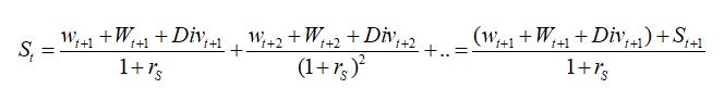 증권의 가치는 일반적으로 그 증권으로부터 얻을 수 있는 미래의 수익을 현재가치로 환산한 것이다. 배당모형에 따르면 주가는 다음과 같이 정해진다. 아래에서 Div는 주주배당, W는 노동자 임금, rX는 증권 X의 할인율을 나타낸다. 시점은 t로 표시한다. 기호를 간편히 하기 위해 E, L을 각각 개별 사권가치를 구성하는 주가와 노동자가치의 의미로도 사용한다.