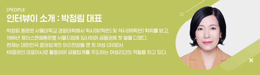 1982년도 서울대학교 경영대학 입학생 325명 중 여성은 오직 3명뿐이었다. 나아가 경영계 전반에 여성이 차지할 수 있는 역할이 제한적이던 시절, 대한민국 금융계를 선도하는 여의도에서 여성이 CEO가 된다는 것은 정말 어려운 일이었다. 그러나 2019년, 82학번 경영대 여학생 3명 중 한 명이었던 박정림 대표님은 최초의 증권가 여성 CEO로서 KB증권의 대표로 부임했다.