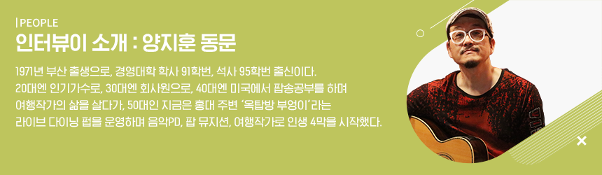 나이 마흔에 하고 싶은 일을 마음껏 해보겠다 작정하고 미국으로 건너갔어요. 팝송 음반을 제작해 발표한 후 미국 일주 버스킹 로드트립을 했는데, 이 이야기가 블로그와 포털 미디어를 통해 조금씩 알려지게 되었죠. 급기야 한 출판사의 제안을 받고 ‘미국을 달리다’라는 여행 책까지 내게 되었는데 이게 덜컥 베스트셀러가 됐어요. 덕분에, 팔자에 없던 여행작가의 호칭까지 붙게 되었고, EBS ‘세계테마기행(‘카리브제도’ 편)’에 큐레이터로 출연한 이후 각종 음악 여행 관련 TV, 라디오 프로그램에 게스트로 간간이 초청되며 방송에 이따금 출연하고 있습니다.