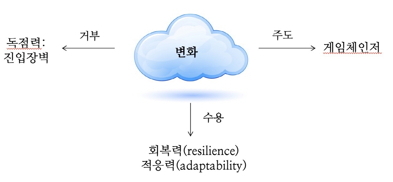 첫째, 변화를 거부한다는 것은 어떤 외부 환경 변화에도 끄떡없는 조직을 구축하고 역량을 개발하는 것을 의미한다. 환경이 변화하지 않는다면 망할 기업은 없다. 하지만 기업을 둘러싼 소비자, 경쟁, 사회와 문화, 법과 정치, 경제, 기술 환경은 끊임없이 변한다. 한동안 중국 특수로 재미를 봤던 화장품 회사들이 사드 사태 이후 대중 관계가 급격히 나빠지자 고심에 빠진다. 최저임금을 급격히 인상하는 시행령이 실시되면서 아르바이트 인력에 의존했던 많은 도소매업이나 음식점은 생존을 걱정한다. 사람들이 점차 텔레비전이나 종이 신문은 보지 않고 휴대폰을 보면서 기업은 광고 매체와 방식을 전면적으로 개편한다. 스트리밍 기술이 발전하면서 음원 및 비디오 콘텐츠 유통 방식이 혁신적으로 변한다. 물론 전 세계에서 일어나는 수많은 변화 속에서, 불멸의 조직을 구축하는 것은 불가능한 과제이다. 우리는 단지 조직의 생명과 영광을 가능한 연장할 수 있는 전략과 역량이 무엇인지 찾으려 노력한다. 대부분 경영학자들은 변화를 거부하는 전략을 가르친다. 이미 많은 것을 이룬 기업인 역시, 어떤 변화에도 흔들림 없는 조직을 구축하는 일에 관심이 많다.
