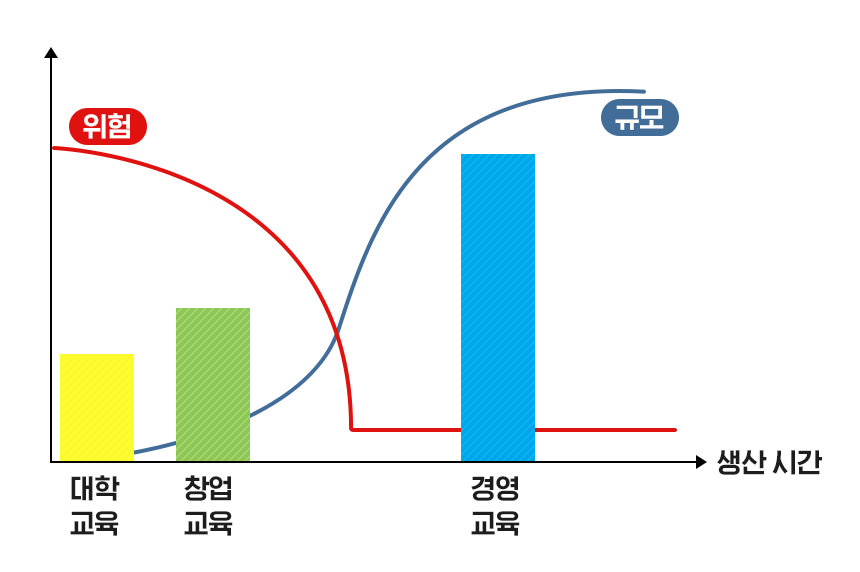 경영학 교육과 창업 교육의 차이는 각자가 대상으로 하는 생산 시스템의 규모와 성과 위험, 두 가지 측면에서 그림 1과 같이 정리됩니다.