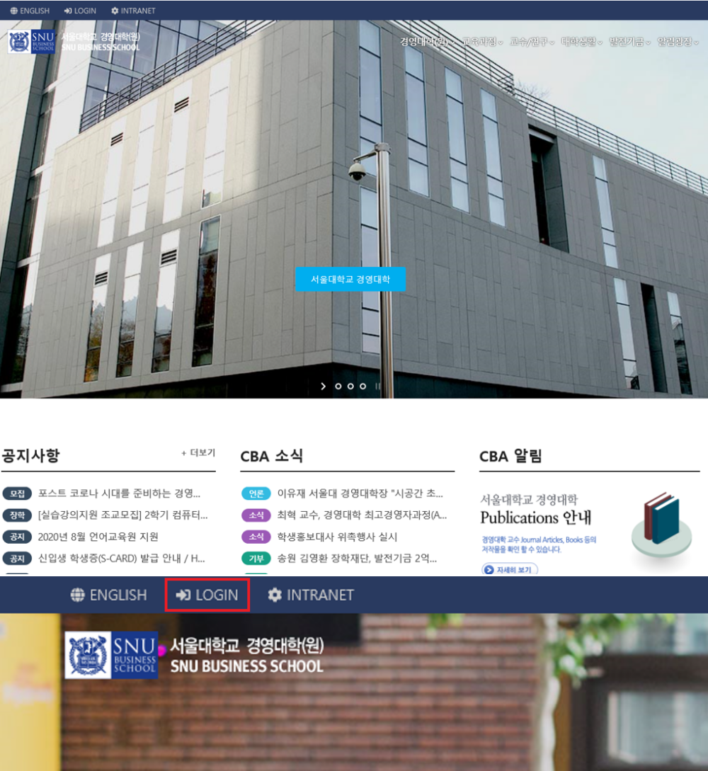 먼저, 서울대학교 경영대학 홈페이지(https://cba.snu.ac.kr)에 접속하여 좌측 상단에 있는 LOGIN 버튼을 클릭해 로그인 페이지로 이동합니다.
