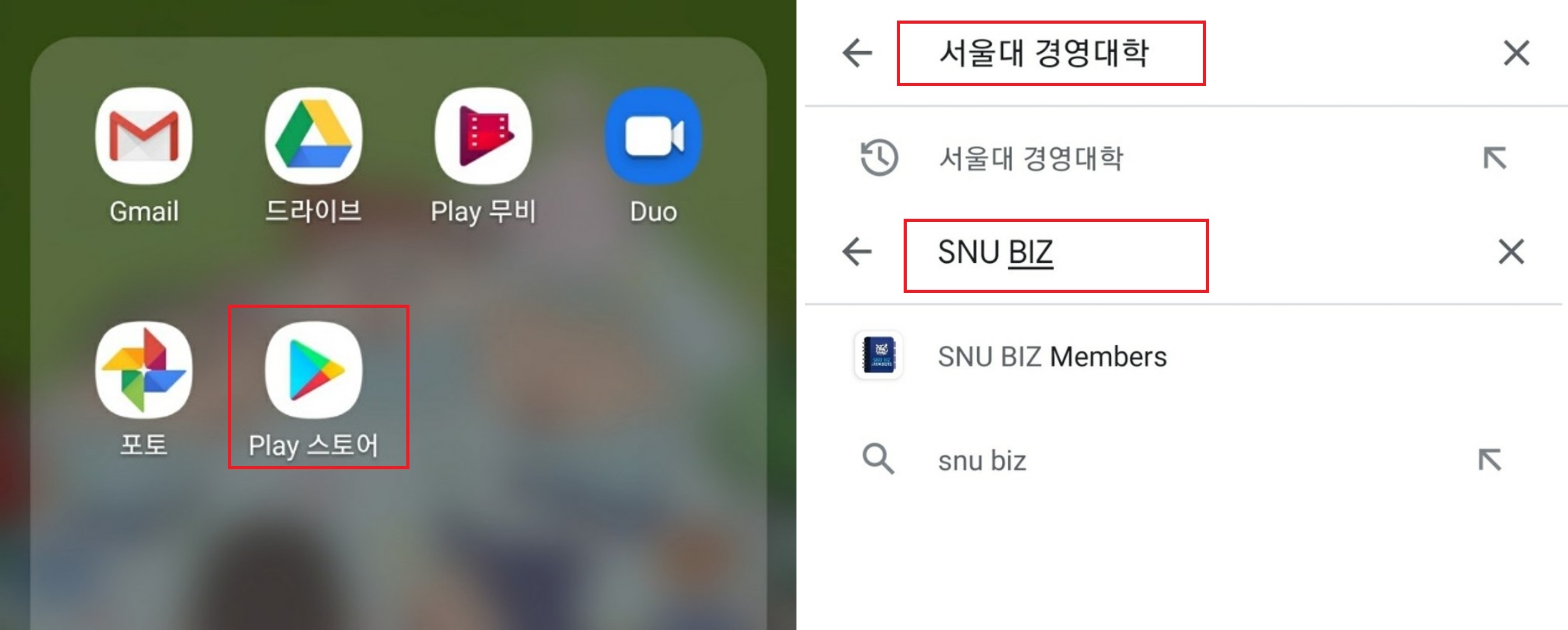 먼저, 구글 Play 스토어에서 ‘서울대 경영’ 또는 ‘SNU BIZ Members’를 검색해 해당 앱을 다운 받습니다. 앱을 실행한 후, 앱 휴대폰 접근권한을 허용하고 휴대폰 인증을 진행합니다.