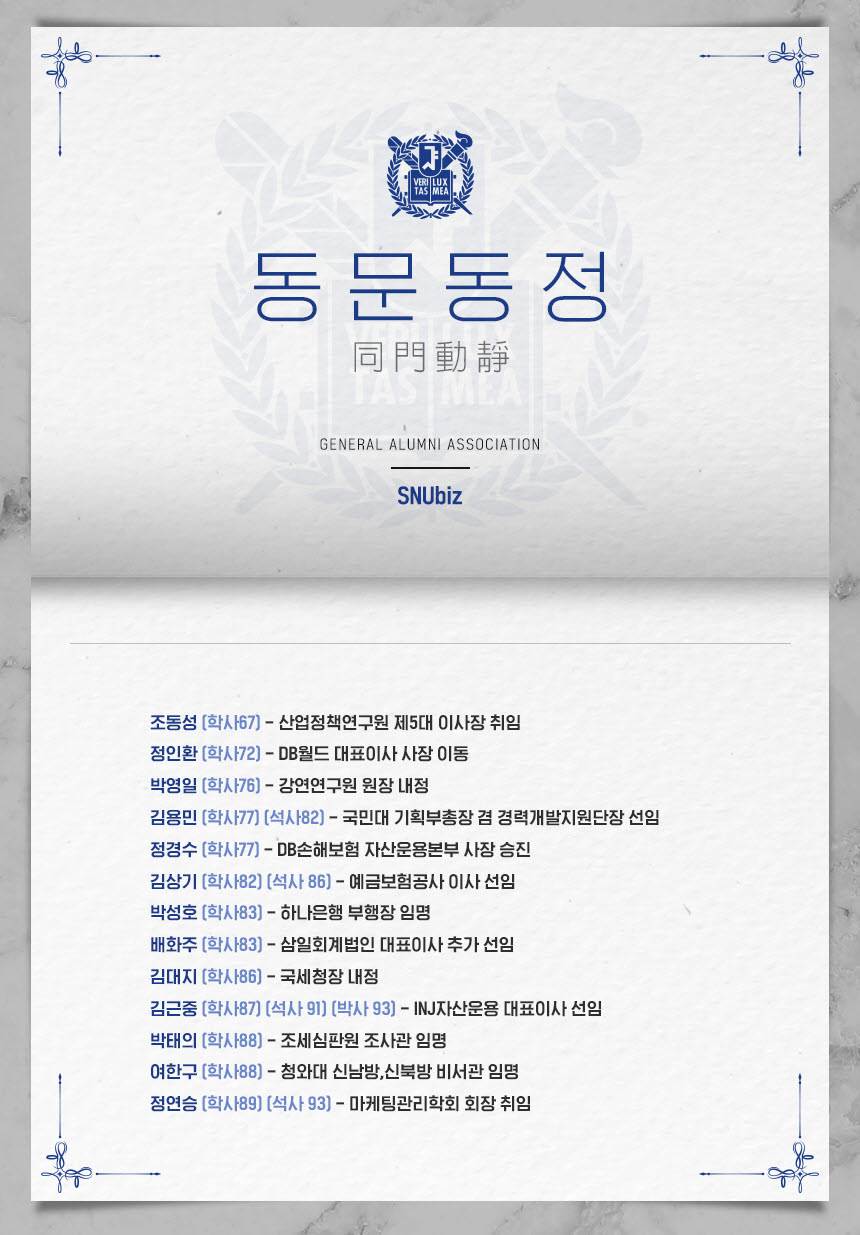 서울대학교 경영대학(원) 동문의 최신 동정입니다. (2020년 9월 기준)